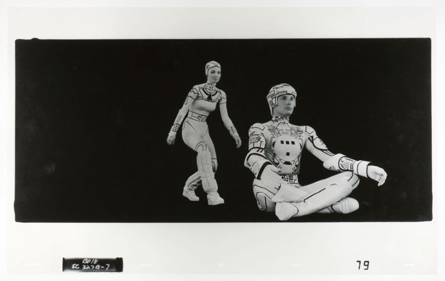 An Ektachrome continuous-tone transparency cel from the Disney Studios film "TRON" (1982). Featuring Tron and Yori in the Master Control Program, the Ektachrome cel was created at the studio and used during the production of the special effects sequences in the film. The groundbreaking film predated modern-day computer animation and effects, requiring the unique lighting effects to be hand-created frame by frame. This painstaking process was only used for "TRON," making the film's effects artwork a special piece of movie history. Measuring 12.5"x20" overall, with the character image measuring 7.5"x10.25", the transparency cel is in very good condition with minor surface scratches and general handling wear.